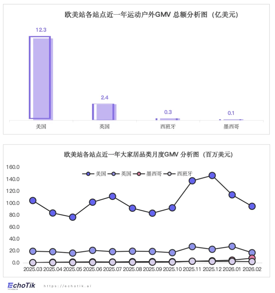 随着全球健康意识加强,运动户外产业正迅步走向大众日常,迈入结构性增长的黄金周期。据Mordor Intelligence《Sports and Leisure Equipment Market Report》数据,2026年全球运动休闲设备市场规模已突破5000亿美元;而TikTok Shop的爆发式增长——据EchoTik数据统计,2025至2026年,运动户外类目全站点GMV已经突破32亿美元,多个站点呈现指数级增长,2026年美国站的年增长率更是高达1900%。