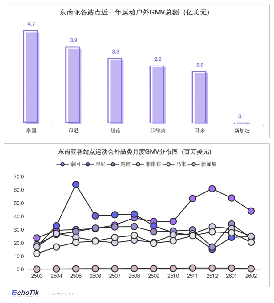 作为东南亚各站点的支柱品类,运动户外凭借其深厚的消费群体基础与高社交属性,相比其他品类规模优势显著,并在近12个月继续保持强劲增长。近一年内,东南亚地区该品类总GMV逼近百亿美元,其中泰国站表现尤为突出,GMV突破4.7亿美元;马印尼站紧随其后,GMV近4亿美元。