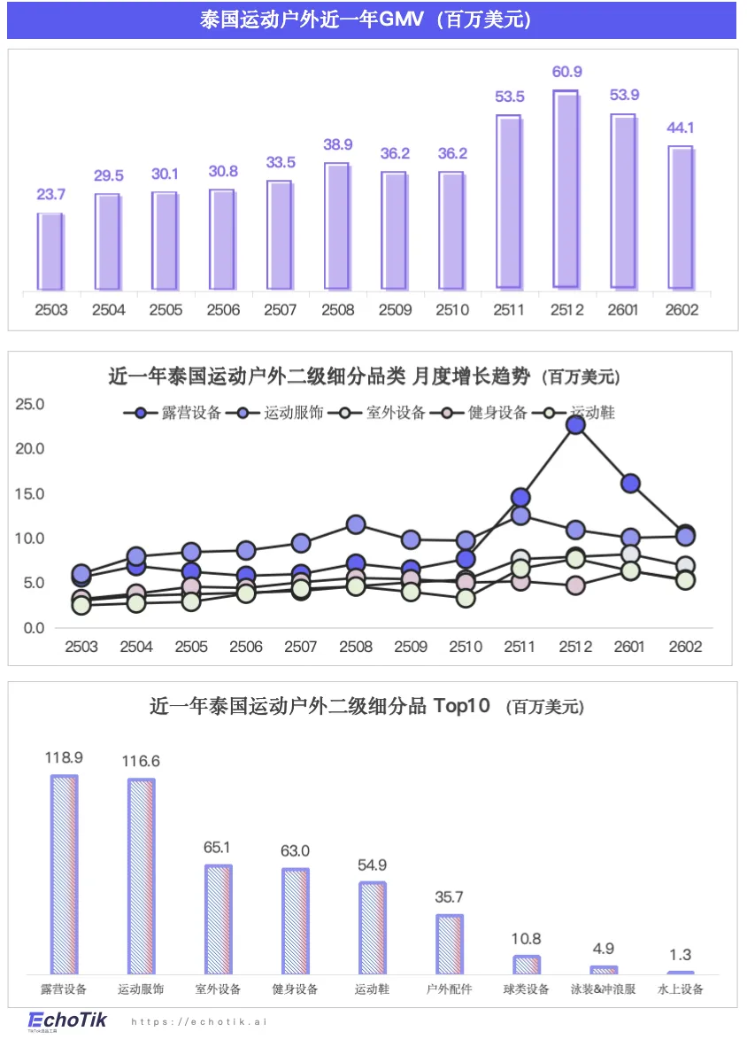 泰国以超4.7亿美元的GMV,领跑东南亚市场的运动户外类目。从月度走势看,从25年第四季度开始,运动户外类目呈现强劲上升趋势。