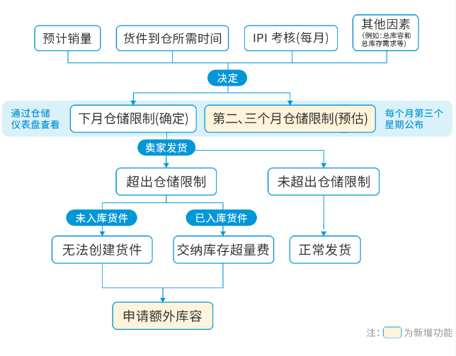 取消额外的补货限制:合并补货限制和仓储限制,采用单一的亚马逊物流仓储额度,每种存储类型的单一限制将决定卖家可以发送并存储到亚马逊运营中心的库存量。 IPI考核变为每月一次:IPI考核变为每个月一次,相应的限制也改为每个月更新一次,每次额度有效期为一个月。 三个月仓储限制预测:除了下个月已确定的仓储容量外,亚马逊还将提供接下来两个月的预估仓储容量。此外,卖家可以按库存状态、库容来源(初始容量或申请的额外容量)细分库容类型。 可申请额外库容:仓储容量不够使用时,卖家可通过仓储限制管理器申请额外库容,卖家每个月可以提交最多5次申请。
