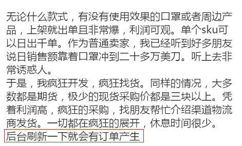 微博上有一个博主,分享自己在亚马逊上卖口罩的经验,听起来非常诱人,“后台刷新一下就能有订单产生”。