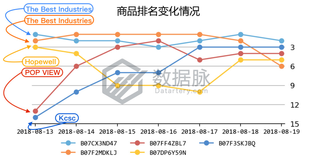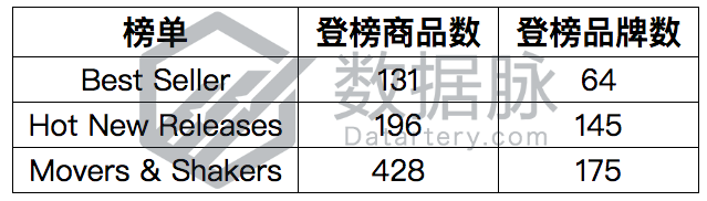 根据上周 Movers & Shakers 榜单上各个品牌下商品的登榜次数,骆探长(shujumai.com)对登榜的品牌进行了排序, 其中排名靠前的五个品牌如下所示: