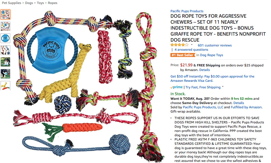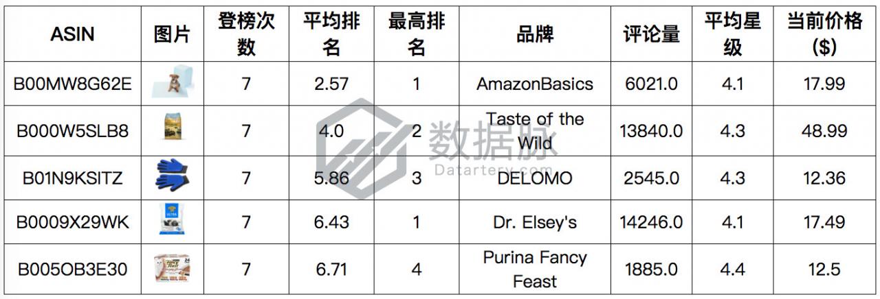 此外,品牌名为Pacific Pups Products的一款宠物狗棉绳玩具也以$21.99的相对高价进入榜单,在四次进榜历程中得到44.00的平均排名,位列商品综合排名第五。
