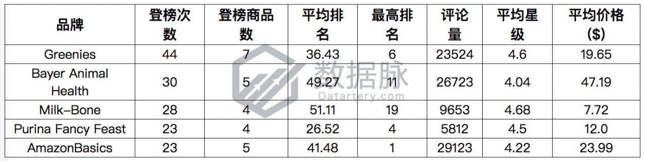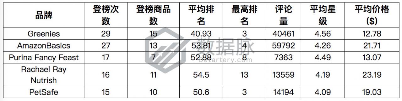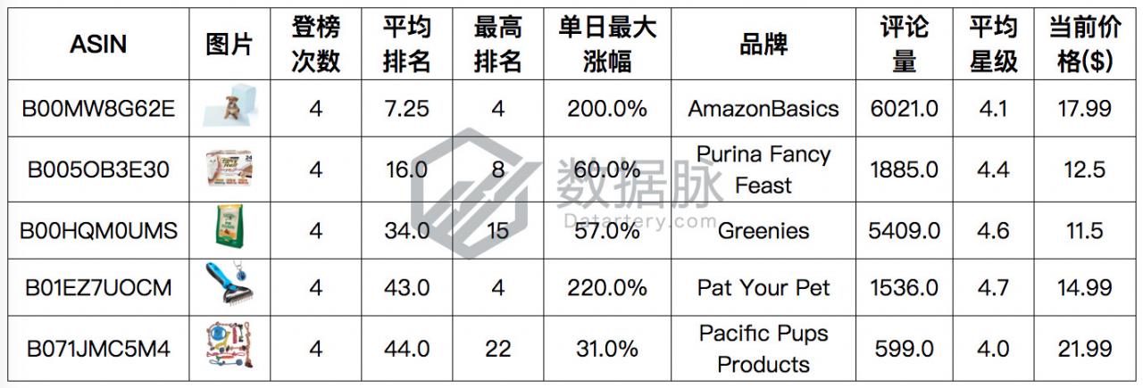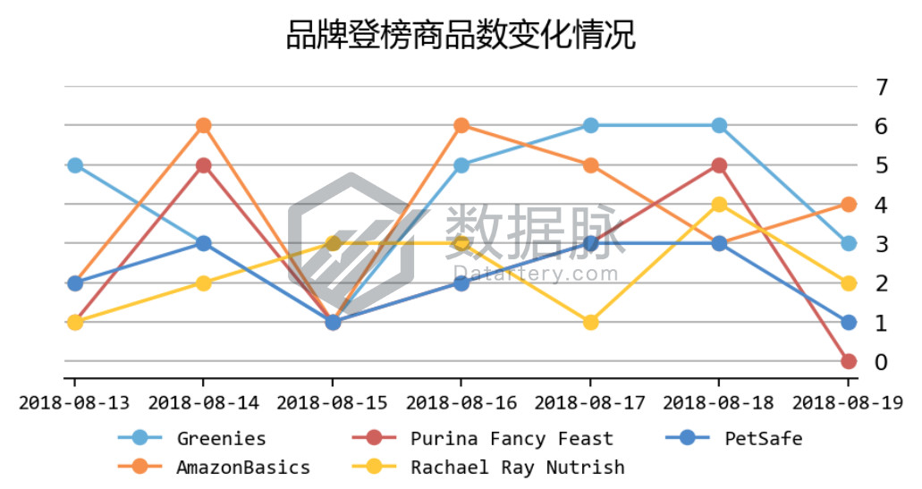 可以看到,在上周Pet Supplies品类的Movers & Shakers榜单中, 品牌竞争同样愈演愈烈。最终,宠物食品品牌Greenies再次以稳健的榜单发挥小胜老对手AmazonBasics,以29次登榜的成绩成功占领品牌综合排名第一的位置。此外骆探长(shujumai.com)注意到,几款经典品牌——Purina Fancy Feast、Rachael Ray Nutrish、PetSafe也在上周发挥稳定,分别位居品牌综合排名的三、四、五位。
