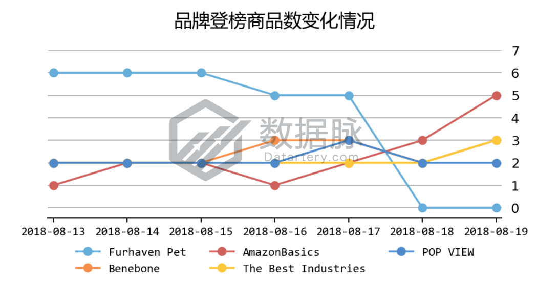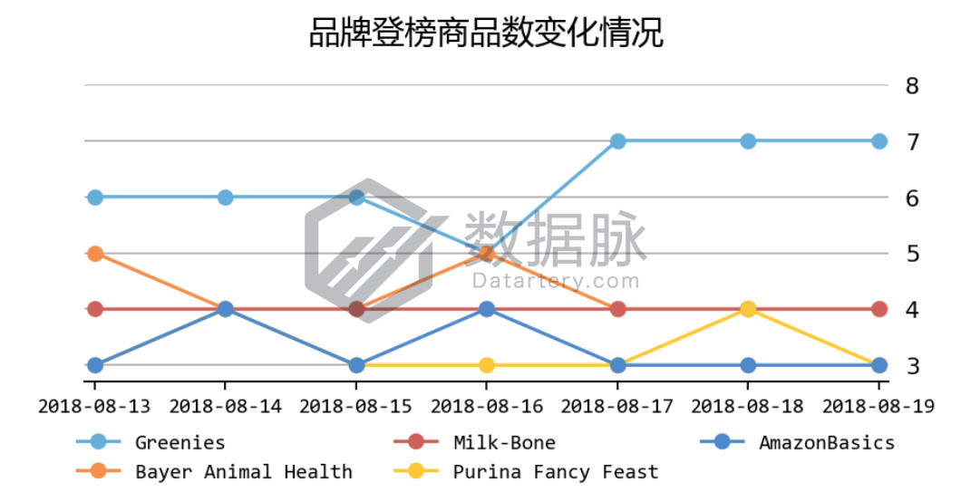 可以看到,在上周Pet Supplies品类的Best Seller榜单中, 宠物零食品牌Greenies愈战愈勇,自8月17日开始每天进榜商品数持续达到7款,以一周登榜次数44次的成绩领先于同榜竞争的其他品牌,位居品牌综合排名首位。此外骆探长(shujumai.com)发现,宠物卫生用品品牌Bayer Animal Health与宠物食品品牌Milk-Bone也在上周成功击败亚马逊自营品牌AmazonBasics,取得28次以上进榜,位居品牌综合排名的第二、三位。