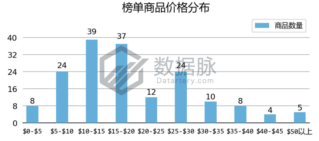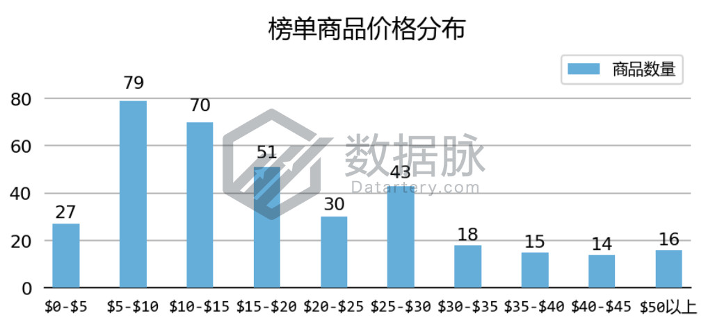 上周 Pet Supplies 品类 Best Seller 榜单商品最高价$79.99, 最低价$1.99,平均价格$20.45。骆探长(shujumai.com)发现,在上榜的商品中, 较多的上榜商品定价于$5.00-$20.00,其中有22.22%的上榜商品位于$5.00-$10.00该价格段,同时有19.44%的上榜商品定价在$10.00-$15.00价格段。此外骆探长(shujumai.com)发现,在高价格段,该周仅有5款上榜商品定价超过$50.00,占上榜商品总数的4.62%。相较于上期分析,该周进入Best Sellers榜单的商品整体价格继续有所下降,低价商品依旧保持着不错的榜单竞争力。