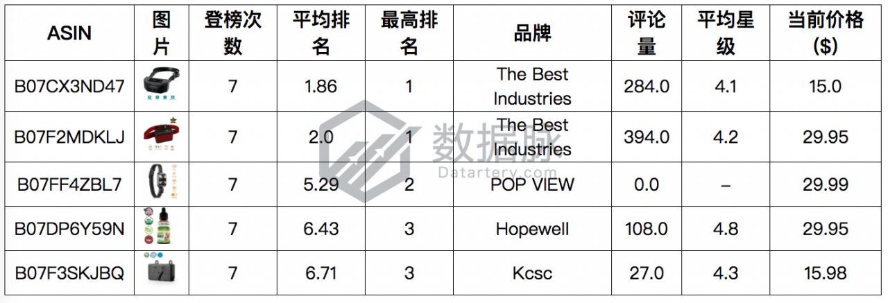 根据上周 Best Seller 榜单上商品的登榜次数及平均排名, 骆探长(shujumai.com)对登榜的商品进行了排序,其中排名靠前的五款商品如下所示: