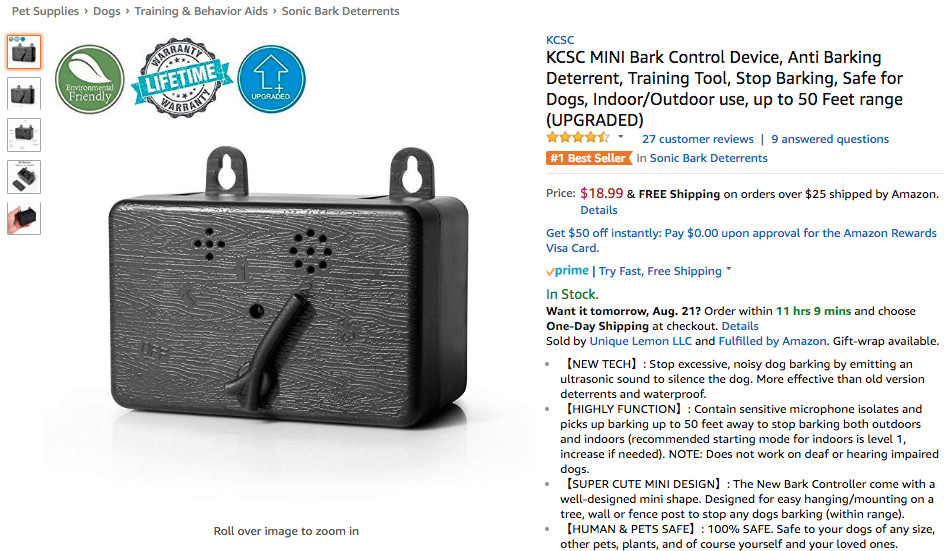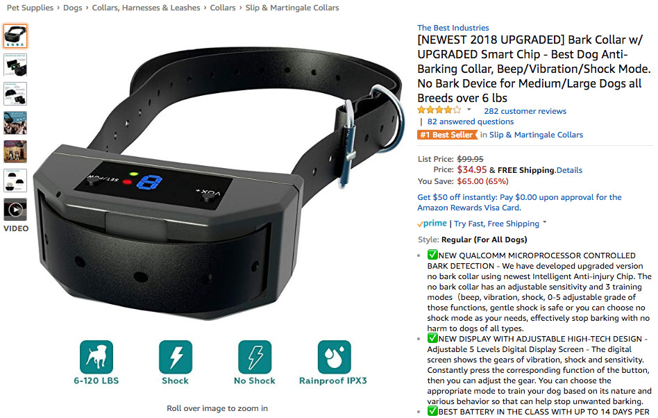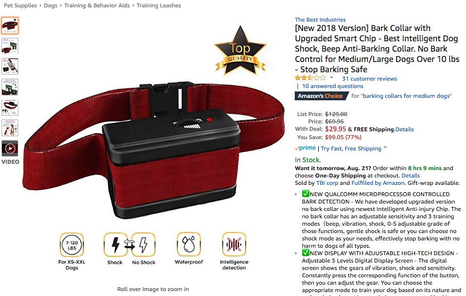 可以看到,在上周Pet Supplies品类的Hot New Releases榜单中, 宠物狗防吠设备再次成为了市场的“宠儿”——骆探长(shujumai.com)发现,在进入上周Hot New Releases榜单综合排名前五的商品中,有四款商品为宠物狗防吠设备。来自品牌The Best Industries的两款2018新式宠物狗放吠项圈成绩突出,其中,具有数显功能的蜂鸣震动电击三模式放吠项圈在一周中两度登顶,位居商品综合排名首位;
