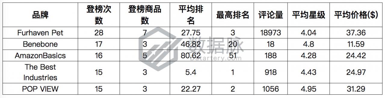 根据上周 Best Seller 榜单上各个品牌下商品的登榜次数,骆探长(shujumai.com)对登榜的品牌进行了排序, 其中排名靠前的五个品牌如下所示: