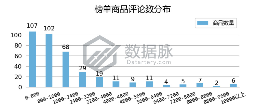 在上周登榜 Pet Supplies 品类 Movers & Shakers 榜单的商品中, 单个商品拥有的最大评论数为19734.00条,最小评论数为0.00条,平均评论数2223.83条,评论平均星级4.34星。 其中,有28.16%的上榜商品评论数在800条以下,另有26.84%的商品评论数在800条至1600条之间,同时有17.89%的商品评论数在1000条至1500条之间。此外骆探长(shujumai.com)发现,上周仅有6款商品评论数评论数超过10000条,占总上榜商品数的1.58%。