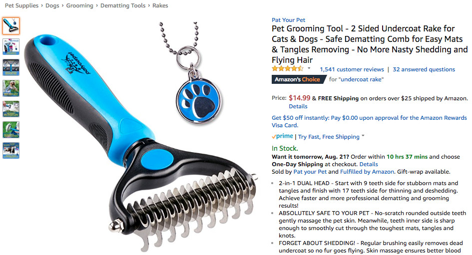 可以看到,在上周Pet Supplies品类的Movers & Shakers榜单中, 商品竞争异常激烈,没有一款商品能够在7天中五次进入榜单。骆探长(shujumai.com)发现,在上周四度进入Movers & Shakers榜单的商品中,除了重返“王位”的AmazonBasics宠物狗尿垫之外,一款来自品牌Pat Your Pet的钢制宠物毛刷产品也于8月15日至17日连续三次进入榜单,并创下了BSR单日最大涨幅220%的不俗成绩。