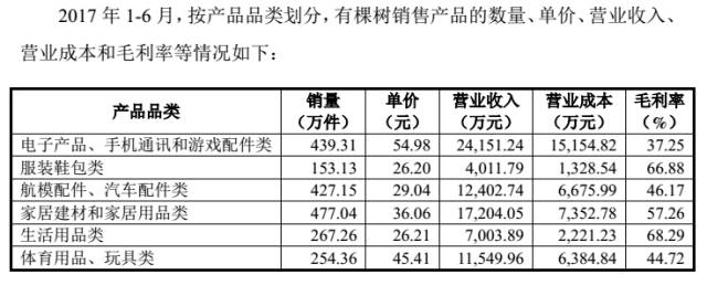 以产品类别来看,有棵树主要经营电子产品,服装鞋包,航模汽配,家居建材,生活用品和体育用品玩具类别。2017年上半年,有棵树的总营业收入为9.6358亿元,营业成本为4.454亿元。如图: