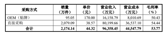 按采购方式划分,有棵树产品的数量,单价,营业收入营业成本和毛利润率情况如下: