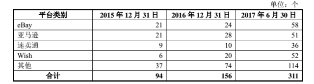 截止到2015年12月31,2016年12月31以及2017年6月30日,有棵树在各家电商平台的网店数量如下: