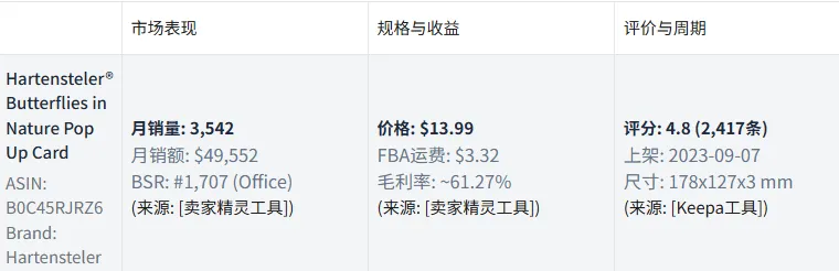 系统自动调用“卖家精灵”等工具,快速抓取了目标竞品的核心市场数据。数据显示,该产品月销量约3,542单,在办公用品大类排名约1,700位,属于表现优异的腰部产品。其4.8的高分(基于2,417条评论)和预估超过60%的毛利率,表明这是一款口碑与利润俱佳的“爆款模型”,属于妥妥的“闷声发大财”型选手。