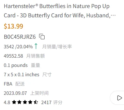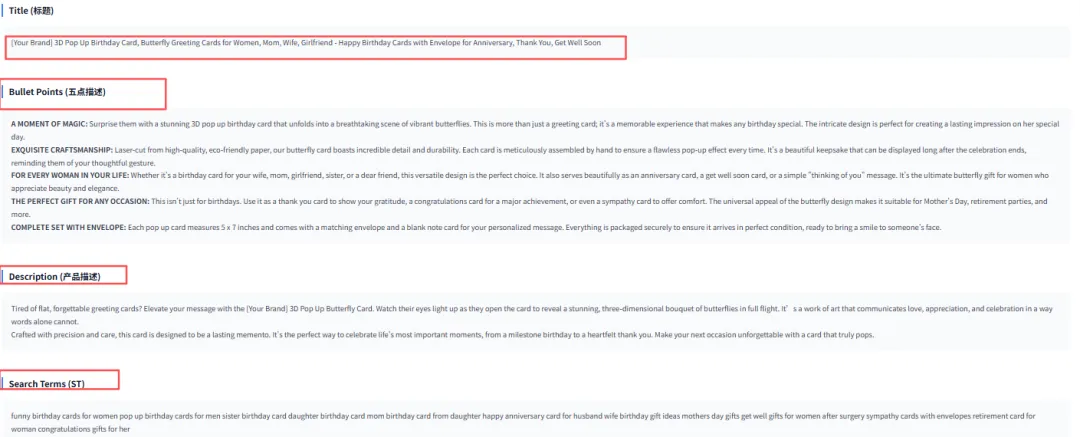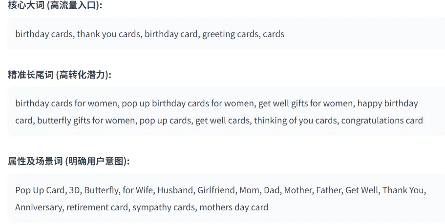 系统反查了竞品的主要流量词,并按搜索权重排序,自动构建了一个结构清晰的关键词库。这个库不仅包含“birthday cards”等高流量大词,也涵盖了“pop up birthday cards for women”等高转化长尾词,以及“for Wife”、“Get Well”等明确用户意图的场景词,等会儿AI自己写文案的时候,则会把这些词根据精准度依次“埋”进去。