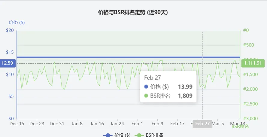 系统自动分析了竞品近90天的价格波动、BSR排名走势及促销活动频率,以评估其市场策略的稳定性与规律。