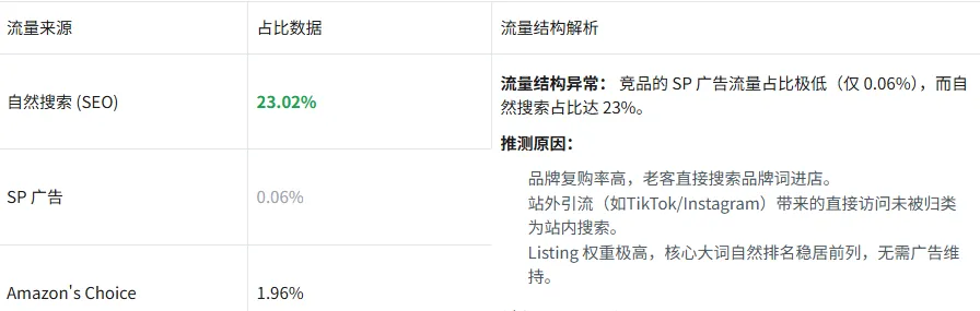 利用“SIF”等工具,系统深度解析了竞品的流量构成。一个关键发现是:该竞品的SP广告流量占比极低(仅0.06%),几乎不打广告!而自然搜索流量占比高达23.02%。这说明啥?这通常意味着其Listing权重极高,核心关键词排名稳固,或拥有强大的品牌效应与站外引流能力。总之,人家Listing权重高得吓人,根本不用靠广告硬砸。我们参考该款竞卖开款和推广时候,也可以试试站外等方式。