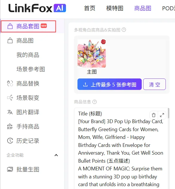 图文案生成后,工作链条并未停止。我们将AI生成的文案和一张产品白底图,导入系统的“商品运营素材”生成功能。