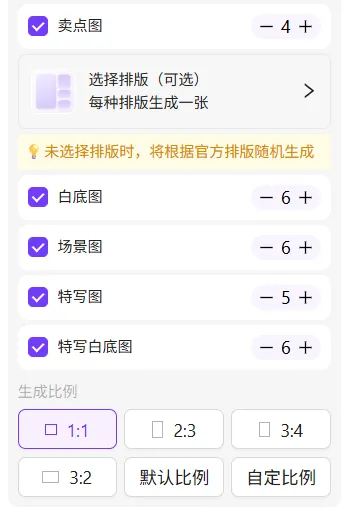 选择图片类型:场景图、特写图、卖点图、A+图.选择生成数量:一次性生成6张。
