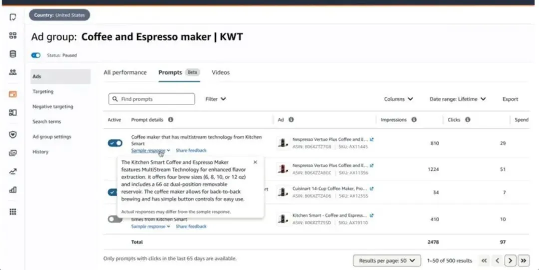 目前,提示词广告已在美国站移动端开启测试,卖家可以在SP广告后台查看系统为商品自动匹配的提示词,以及各提示词对应的曝光量、点击量和费用等数据。