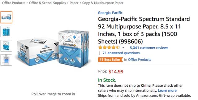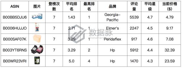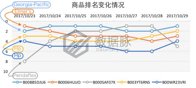 可以看到,在上周Office Products品类的Best Seller榜单中,品牌Georgia-Pacific的标准92多用纸产品在7天中4次占领榜单首位,位列综合排名第一。