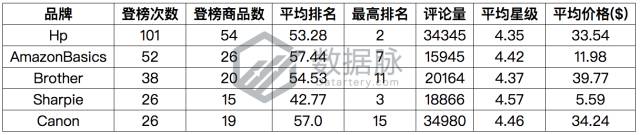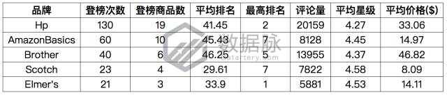 可以看到,在上周的Best Sellers榜单中,品牌Hp保持着对榜单的绝对统治力,以总登榜次数130次的巨大优势夺得品牌综合排名首位。此外,亚马逊自营品牌AmazonBasics、墨盒品 牌Brother、胶带产品品牌Scotch、胶水产品品牌Elmer‘s也有不错的榜单发挥,分别位列品牌综合排名二、三、四、五位。