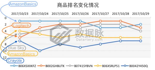 可以看到,在上周Office Products品类的Hot New Releases榜单中,几位在上期分析中叱咤榜单的“老面孔”依旧活跃于榜单前列,其中AmazonBasics的彩色卡纸凭借在一周中4次登顶的优秀成绩夺得综合排名 首位。