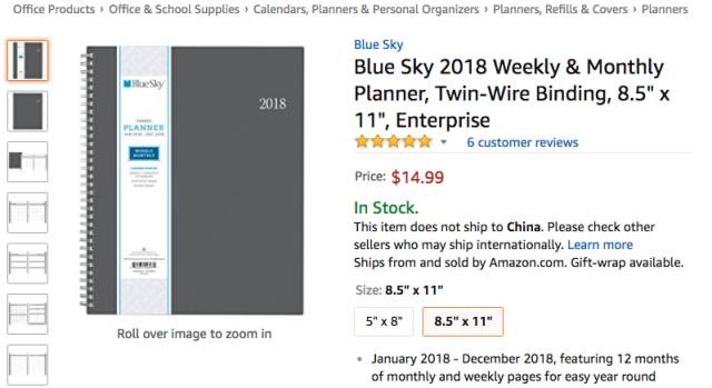 此外骆探长(shujumai.com) 注意到,一款品牌为Blue Sky的带2018年日历的活页笔记本产品在上周表现抢眼,于2017年10月23日至28日榜单排名一路稳步上升,两次跻身Hot New Releases榜单前二,位列综合排名第四,目前该商品仅有5条买家评论,评论星级为5.0满分,后续市场表现值得进一步关注。