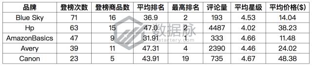 可以看到,在上周Office Products品类的Hot New Releases榜单中,活页册与台历产品品牌Blue Sky延续着上期分析中的优秀表现,在七天中共获得71次登榜,位列品牌综合排名首位。此外,品牌Hp、AmazonBasics、Avery、Canon分别位列品牌综 合排名二、三、四、五位。
