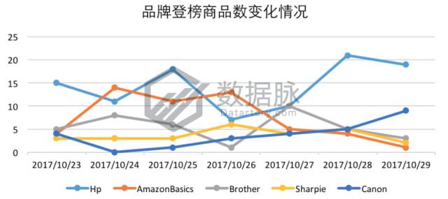 可以看到,在上周Office Products品类的Movers & Shakers榜单中,五大品牌展开了激烈竞争。骆探长(shujumai.com)发现,最终国际知名品牌Hp再度技高一筹,凭借在周末两天分别登榜21款与16款商品 的优秀表现,击败与之竞争的其他品牌对手,成功取得品牌综合排名首位。此外,亚马逊自营品牌AmazonBasics、打印机相关产品品牌Brother、马 克笔品牌Sharpie、墨盒品牌Canon分别位列品牌综合排名二、三、四、五位。