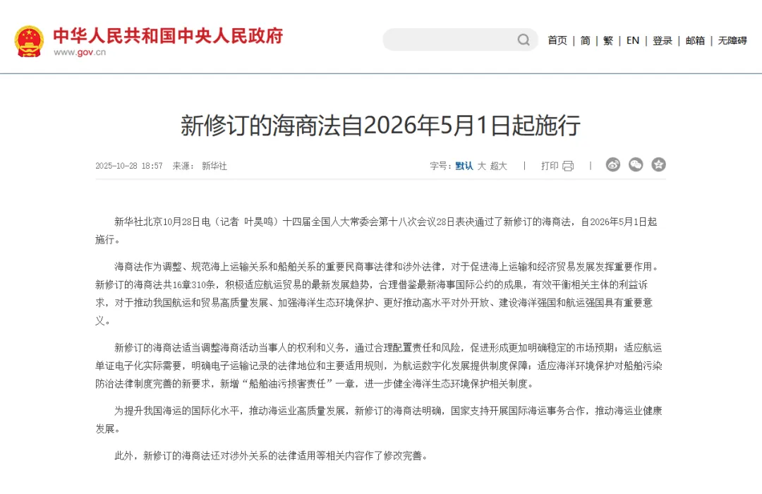 2026年5月1日,新修订的《中华人民共和国海商法》(以下简称“新《海商法》”)正式施行。其中,第93条关于“目的港无人提货”的责任规则,迎来了颠覆性调整——沿用30余年的“收货人承担主要责任”原则,被彻底改写为“托运人原则承担责任”。
