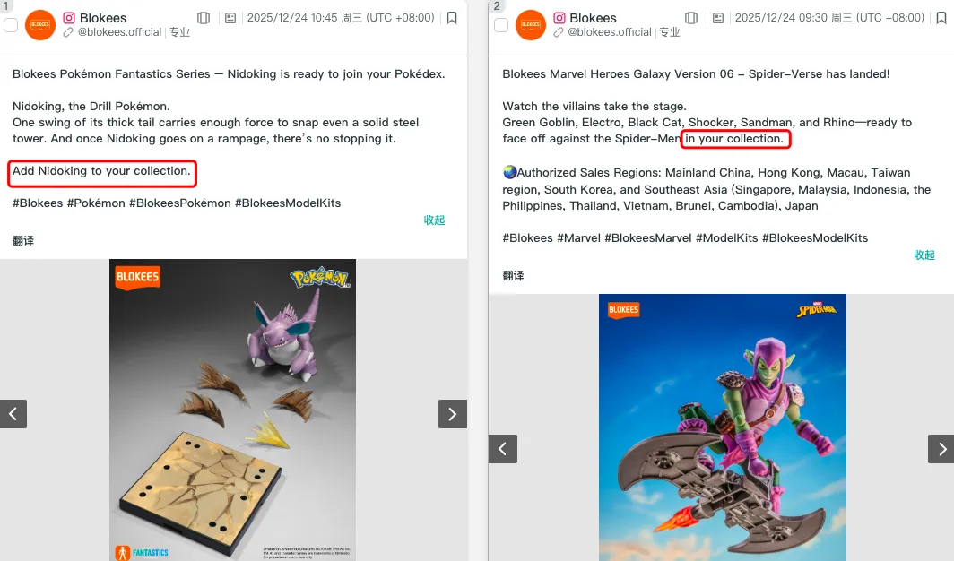 如果观察布鲁可在新品发布阶段的社交媒体帖文,会发现一个高频出现的关键词组合:shelf、collection。布鲁可常使用的是一种“邀请式”的语言——例如“快把 XX 加入你的收藏架”“让 XX 成为你 collection 的一部分”。