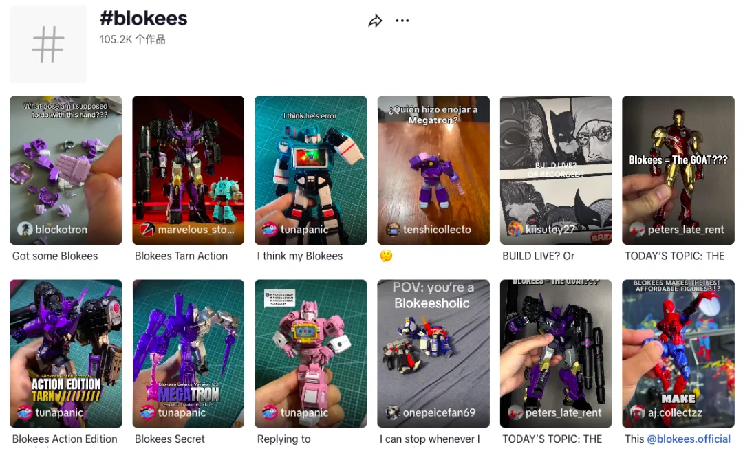在 TikTok 上,#blokees 话题下已经聚集了超过 10 万条视频,而其中播放量和互动率最高的内容,几乎全部来自定格动画创作者、模型玩家和潮玩博主。