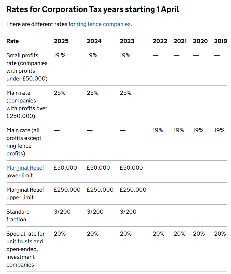 自2023年4月1日起,如果公司的利润超过250,000英镑,则公司税的税率为25%;若利润不超过50,000英镑,则公司税的税率为19%;若利润在50,000英镑至250,000英镑之间,则公司税会先以25%的税率计算,然后根据公司的实际利润,以边际减免(Marginal Relief)的形式降低实际应缴纳的公司税税金。