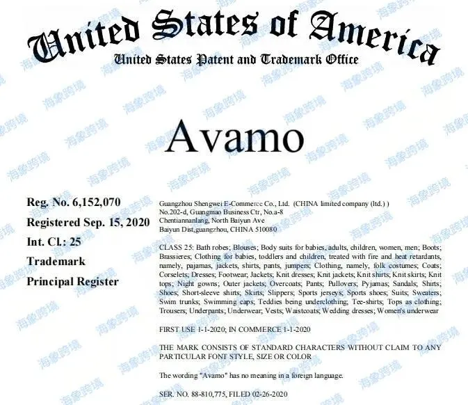 本案为国人原告,案件涉及商标 AVAMO 商标注册在25类服装鞋帽类。原告的前身公司还曾于2024年在美国维权发案,请服饰相关卖家注意排查下架!