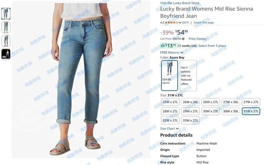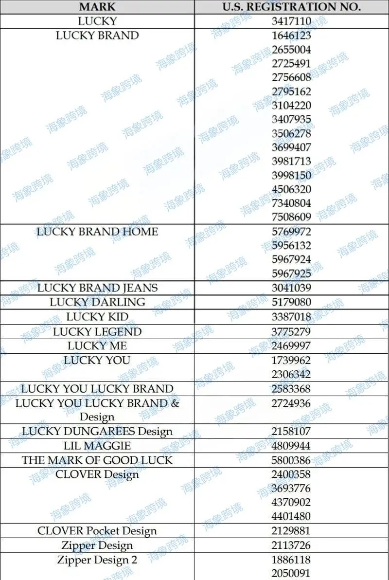 原告 LUCKY BRAND 服饰品牌专营牛仔服,同时也销售其他服装,包括运动服、外套、T恤、职业装及其他产品。其注册商标已在商业活动中持续使用多年,部分商标最早可追溯至1990年,涵盖众多产品,包括但不限于牛仔裤、鞋类、内衣、泳装、珠宝、手表、眼镜等。涉案商标较多,相关卖家注意排查避雷!
