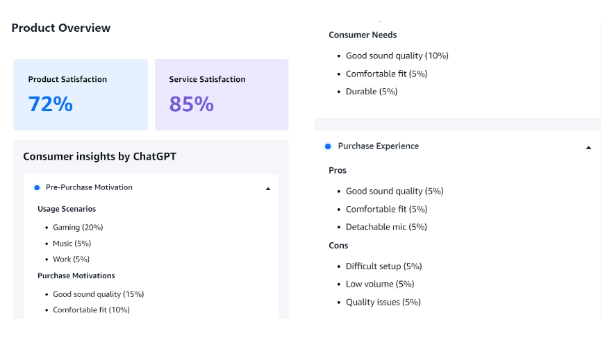 1.一键获取 ChatGPT 对产品的智能分析,如:对手产品/服务满意度、产品优劣势、客户画像分析、购买动机、消费者预期等。
