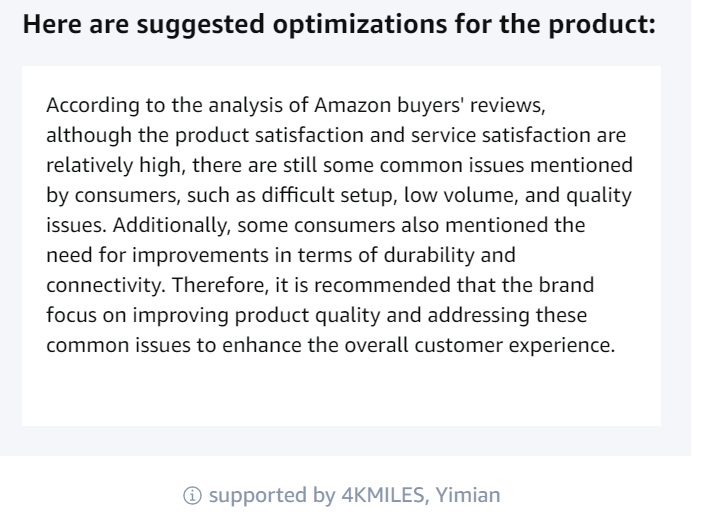 借助 ChatGPT,4K VOC 提供强大的亚马逊评论分析和 Listing 优化建议,帮助品牌卖家针对不同地区、市场制定有效的策略,用数智化用户声音洞察帮助卖家优化和升级产品,提高产品销量和星级评价,实现产品业务可预计增长。