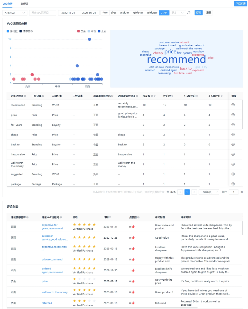 聚合评论内容:4K VOC工具可以统计各个话题词出现频次与情感分布,帮助卖家快速了解产品整体评分状况与买家核心诉求。