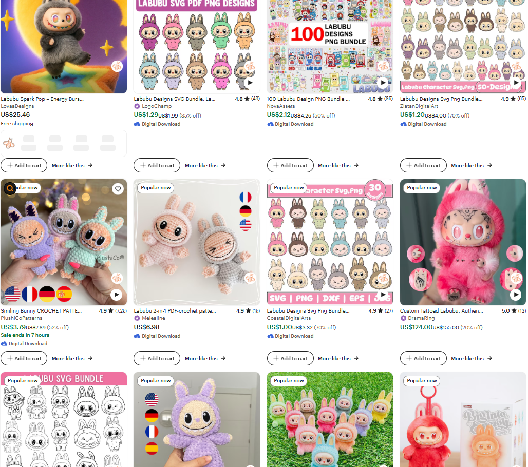 也是我们很熟悉的一些定制与手工类产品。但是这里有一个labubu的风,也刮到了我们ETSY平台了。