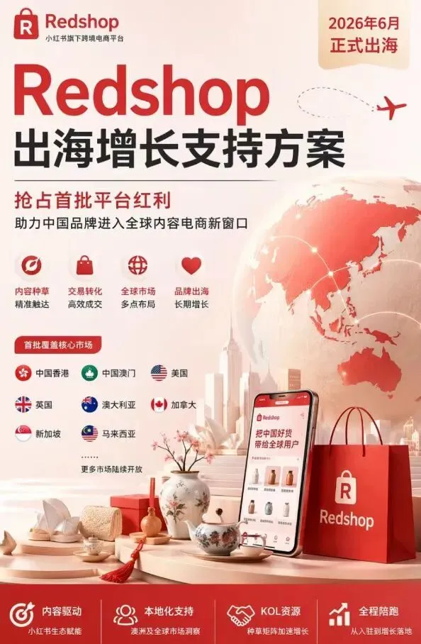 2025年3月10日,小红书正式推出“电商出海领航计划”,后续又计划在2026年6月上线独立跨境电商平台Redshop,逐步从“生活方式社区”向全球跨境电商转型,其核心目标是避开与Temu、SHEIN等巨头的正面价格战,凭借内容优势和差异化选品突围。