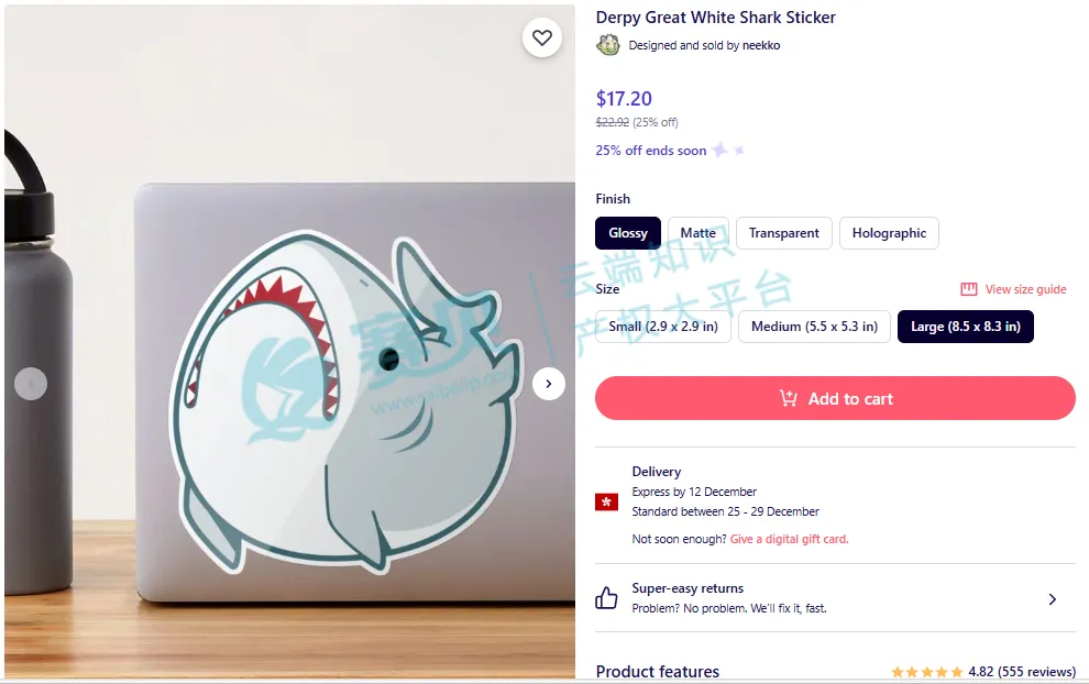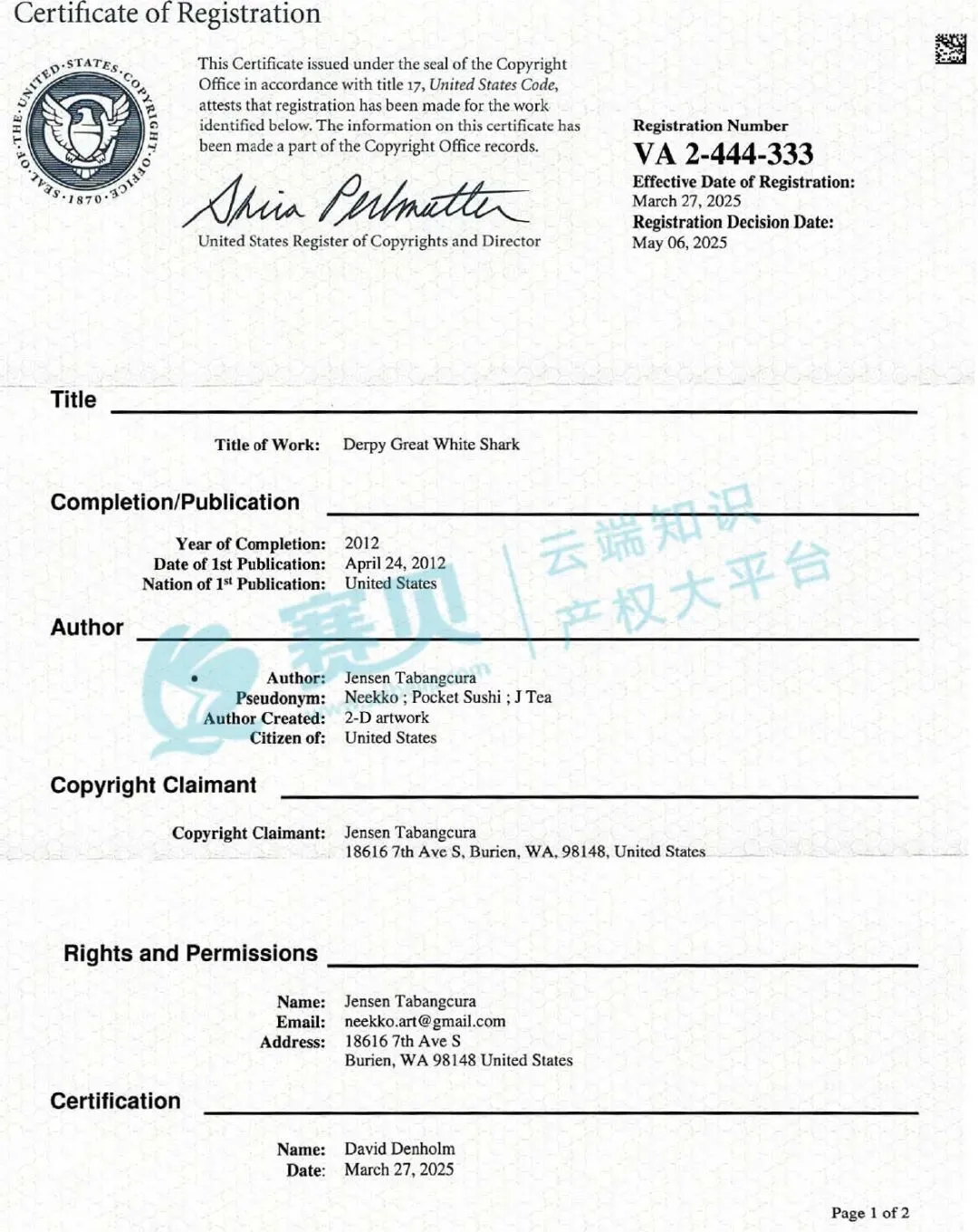 原告此次维权的是《Derpy Great White Shark》(呆萌大白鲨),版权注册号为 VA 2-444-333。该作品完成于 2012 年 4 月 24 日首次在美国发表,版权注册生效日期为 2025 年 3 月 27 日。赛贝提醒跨境卖家,未经授权不得擅自使用,以免引发侵权风险。