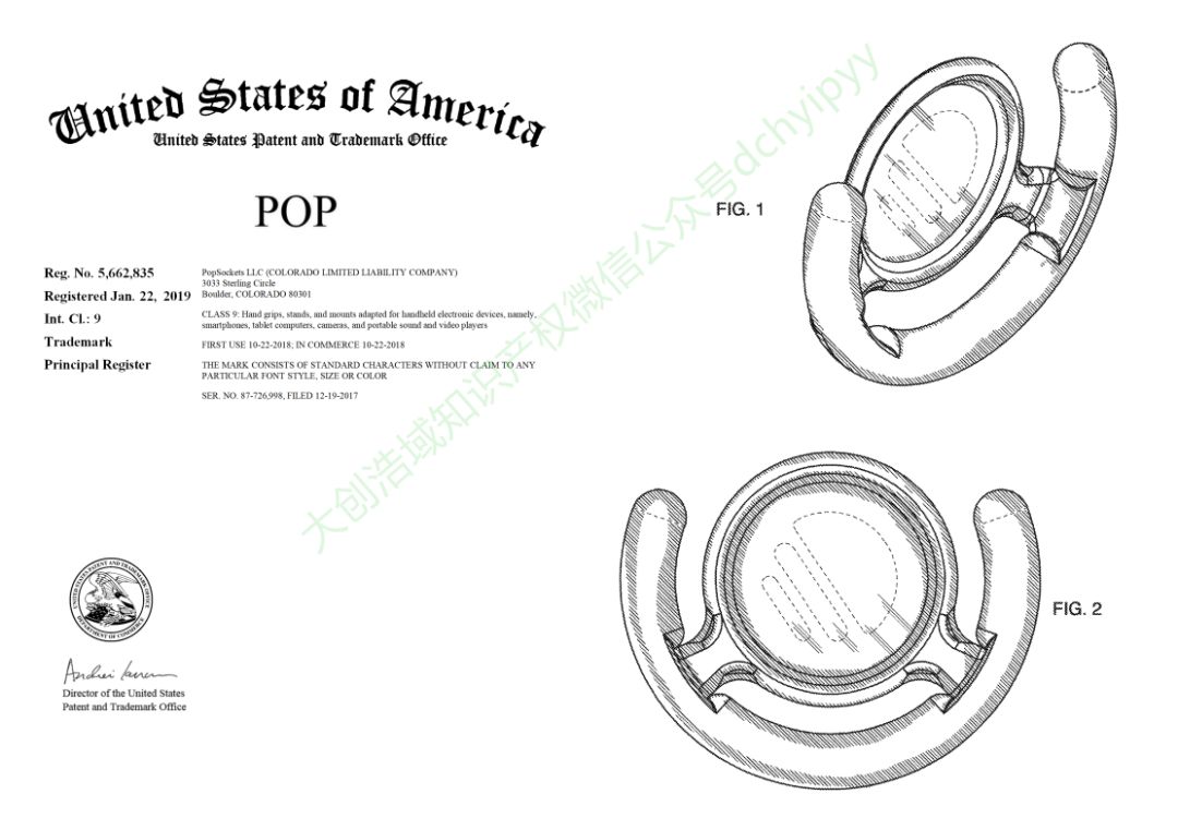(POP手机支架,上图左边为“POP”美国商标,右边为手机支架美国专利图)