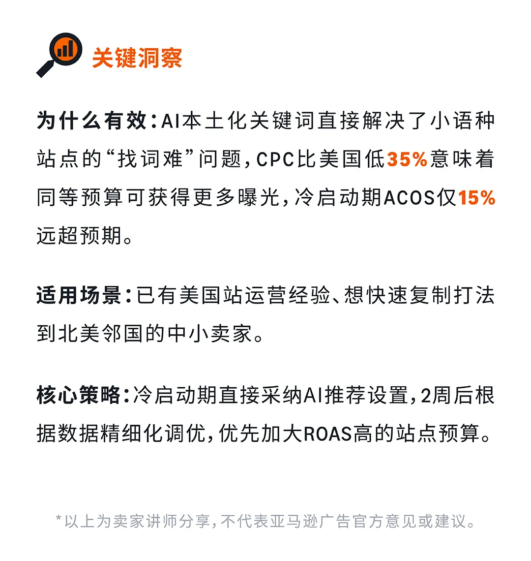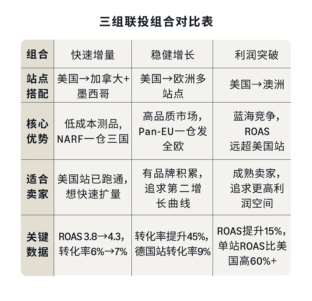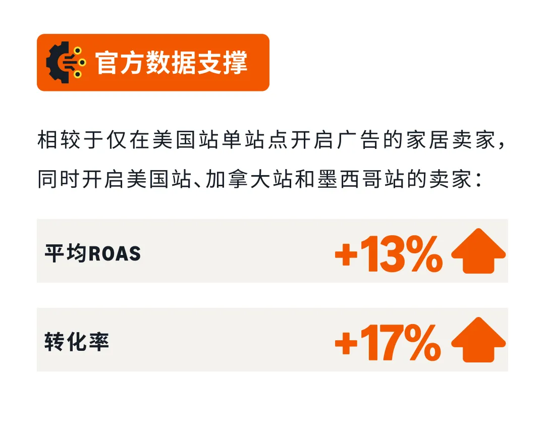 组合一:快速增量组合(美国→加拿大+墨西哥) 适合已跑通美国站基础模型的卖家。借助NARF远程配送,无需在目的国备货即可测品。亚马逊官方数据显示,三站联投卖家平均ROAS从3.8提升至4.3,转化率从6%提升至7%。墨西哥家居新卖家GMV占比11.8%,是美国(4.9%)的2.4倍,竞争强度低,窗口期充足。卖家讲师Sharon实测:墨西哥站首月ACOS仅15%,CPC比美国低35%,首月流量增长210%。