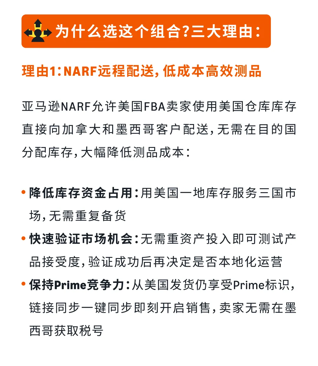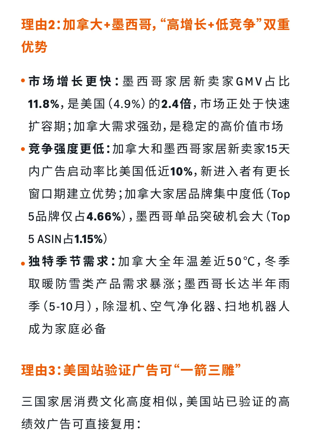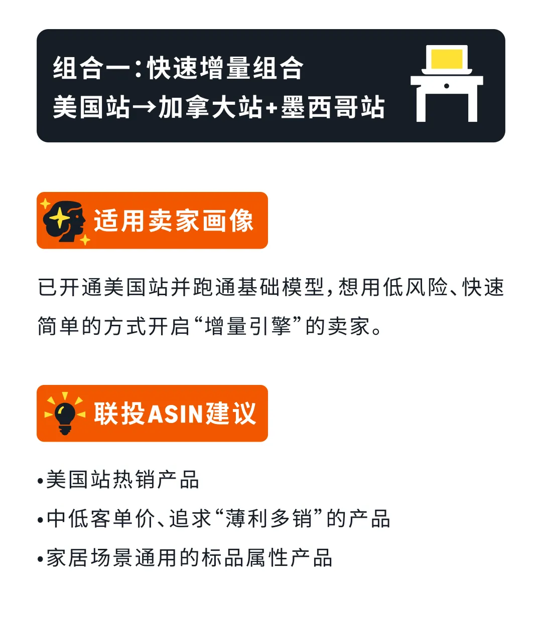 组合一:快速增量组合(美国→加拿大+墨西哥) 适合已跑通美国站基础模型的卖家。借助NARF远程配送,无需在目的国备货即可测品。亚马逊官方数据显示,三站联投卖家平均ROAS从3.8提升至4.3,转化率从6%提升至7%。墨西哥家居新卖家GMV占比11.8%,是美国(4.9%)的2.4倍,竞争强度低,窗口期充足。卖家讲师Sharon实测:墨西哥站首月ACOS仅15%,CPC比美国低35%,首月流量增长210%。