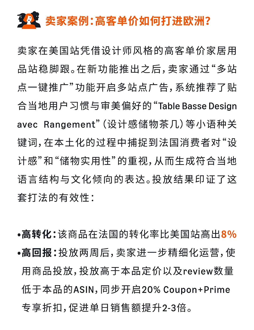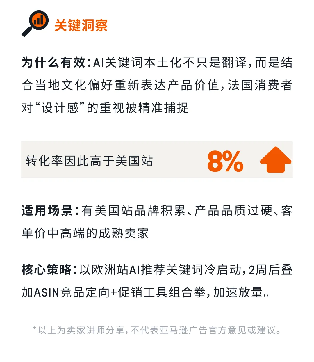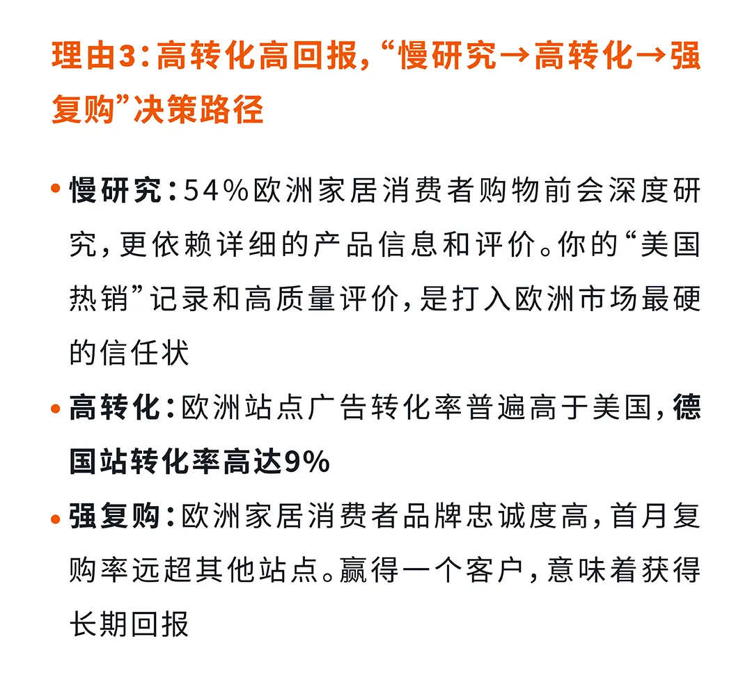 组合二:稳健增长组合(美国→欧洲多站点) 适合有品牌积累、追求第二增长曲线的卖家。欧洲中高端家居市场规模达501亿美元,德国站广告转化率高达9%,同时开启美国站与欧洲站的家居卖家平均转化率提升45%。AI关键词本土化结合文化偏好,Sharon案例中法国站转化率比美国站高出8%,叠加ASIN竞品定向+促销工具后单日销售额提升2-3倍。