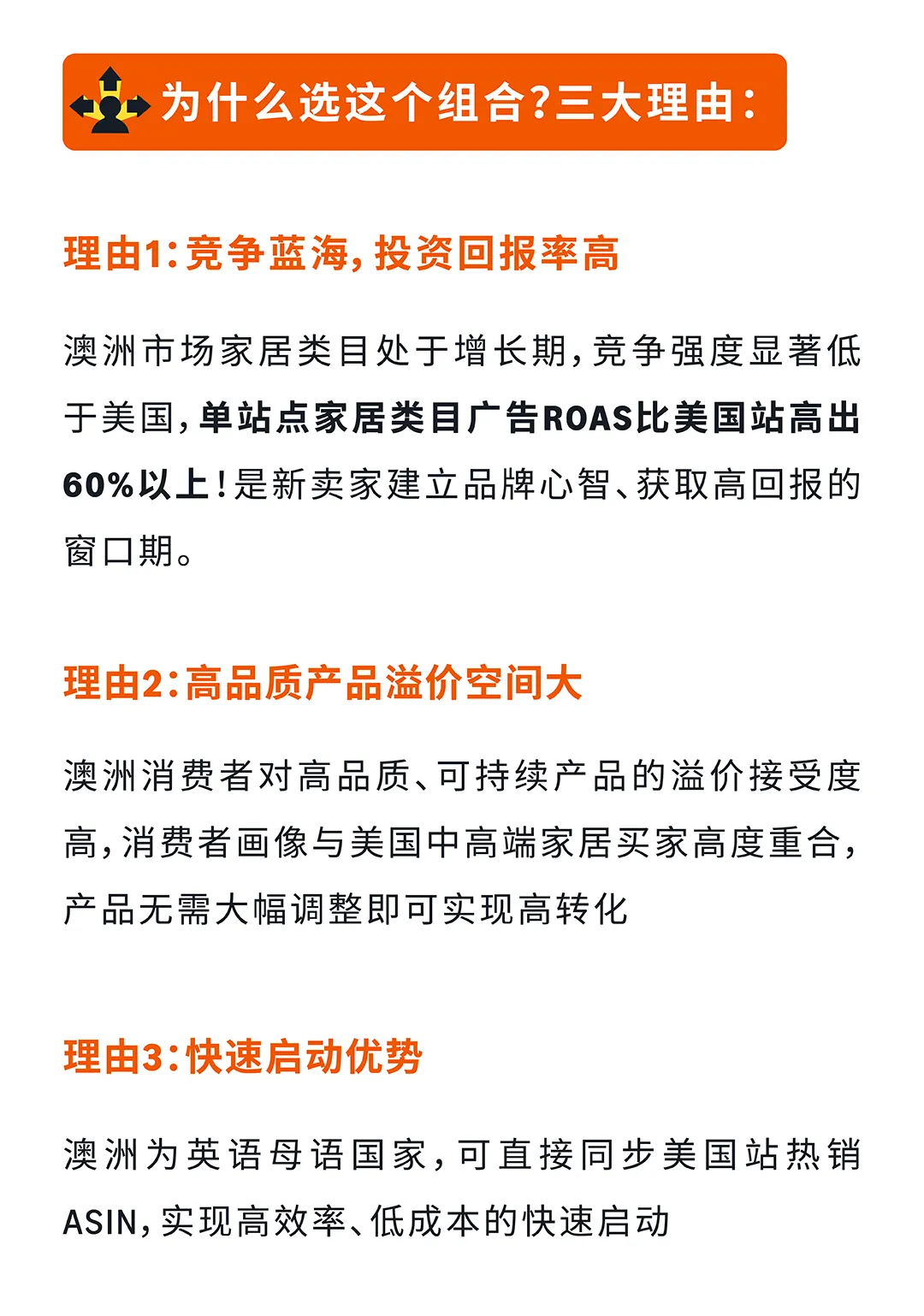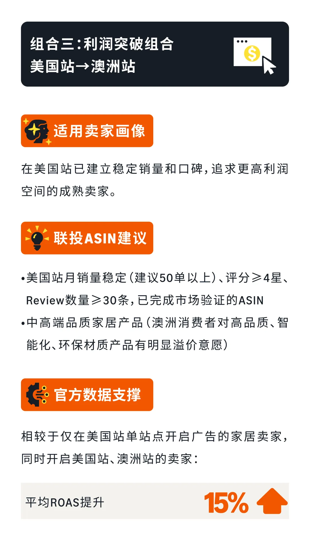组合三:利润突破组合(美国→澳洲) 适合成熟卖家追求更高利润空间。澳洲家居类目ROAS比美国站高出70%60%以上,竞争蓝海,溢价空间大。澳洲英语母语,可直接同步美国站ASIN快速启动,三多站联投平均ROAS提升15%。