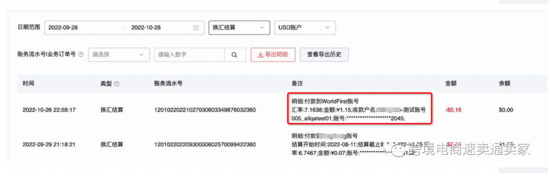 此外,由于所有的余额会在每周四的打款中付清,因此在俄罗斯的结算账单页面,【换汇结算】账务流水中的备注将不再包含“结算开始时间”、“结算截止时间”字段,最新备注显示如下图红框处所示。