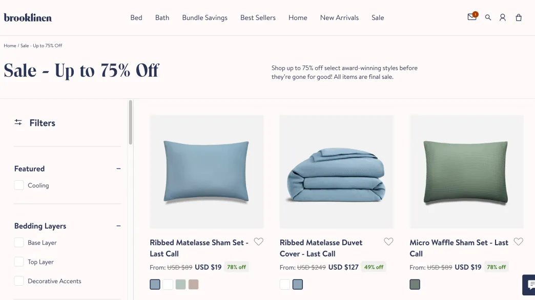 那些只想购买单件床单或枕头的顾客,往往会被引导购买整套床上用品,捆绑套餐提供的折扣会进一步促使他们购买更多商品。这一捆绑销售的策略让 Brooklinen 的客单价提升了大约 30%。